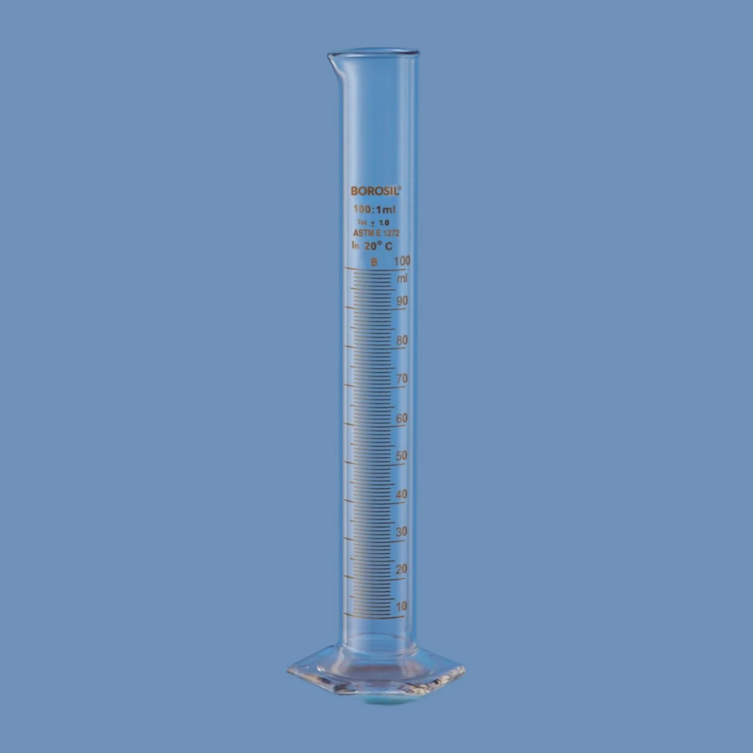 Complies with ASTM E 1272 • Graduated, Single Metric Scale • Each cylinder is engraved with a unique serial number, and comes with a Certificate of Calibration traceable to national standards •Graduations in amber enamel • Sturdy hexagonal base prevents roll-over and ensures greater stability • Calibrated at 20°C |