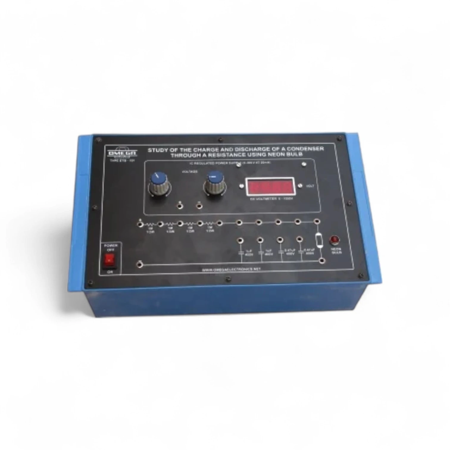 This experimental setup is designed to demonstrate the charging and discharging characteristics of a capacitor (condenser) through a resistor using a Neon bulb as a visual indicator. The neon bulb lights up at its breakdown voltage, offering a striking visual cue for understanding RC time constants and threshold behavior in capacitor charging cycles. The trainer includes a regulated power supply, a high-quality capacitor-resistor network, a Neon bulb for visual feedback, and 1 digital voltmeter to observe voltage levels across the capacitor over time. This model is ideal for students studying basic electronics, physics, or electrical engineering, helping them grasp foundational time-dependent behavior in RC circuits. Key Features: