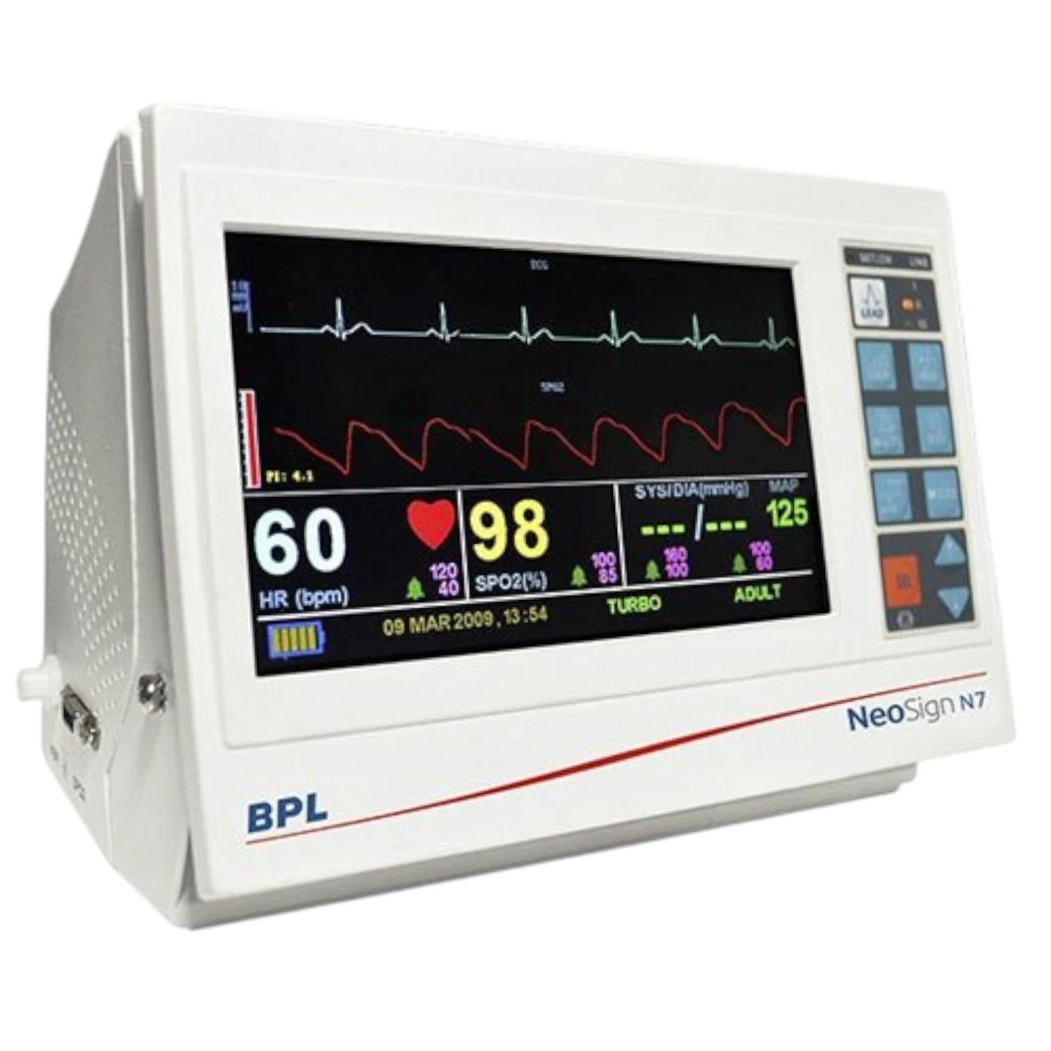 • 7-inch LCD screen • Monitors and records ECG, SpO2 (MASIMO / Nellcor), SunTech® NiBP • Detects and indicates occurrence of Arrhythmia • Memory storage: 24 hrs of graphical and tabular NiBP trend with alarm condition • Zoom option in graphical trend facilitates more accurate analysis • The device offers user-selectable color scheme |