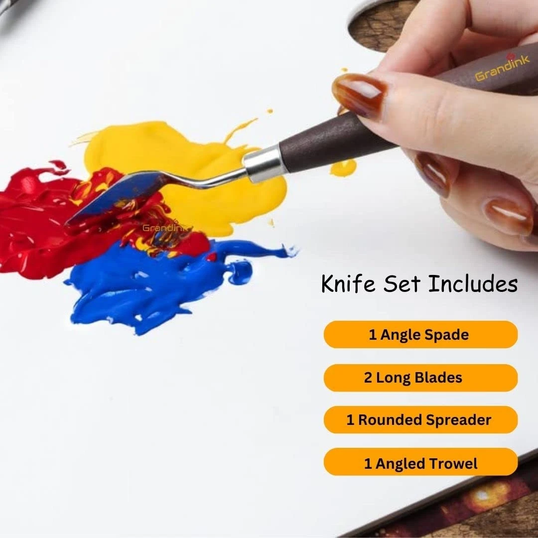 🎨5 painting knives of sizes 1 to 5. Use for Applying paints, pastes & pigments directly onto the Canvas. 🤎The Brown Wooden handle feels very premium and ergonomically designed. handle adds comfort and grip to every application ✨It is widely used in various paintings such as Oil, Canvas, Acrylic, and more. Not only create diverse painting performances but also different knives also have different drawing methods. ✪Thin and Slightly Flexible Blades help in applying paint properly. Use this set for painting and various art projects. Suitable for amateur as well as professional Artists. |