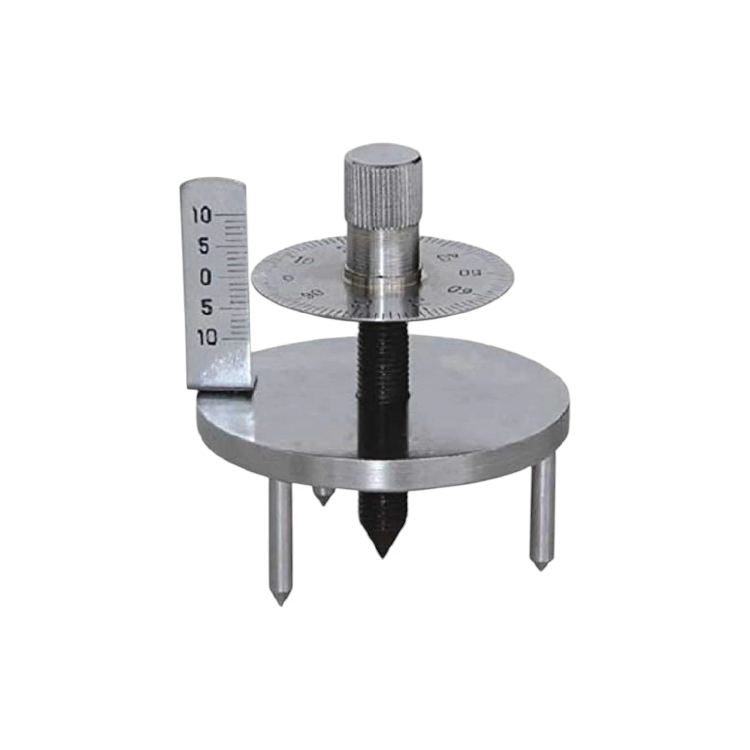 The spherometer is designed to precisely measure the radius of curvature of spherical surfaces such as lenses or mirrors by using a central micrometer screw and three-legged base.