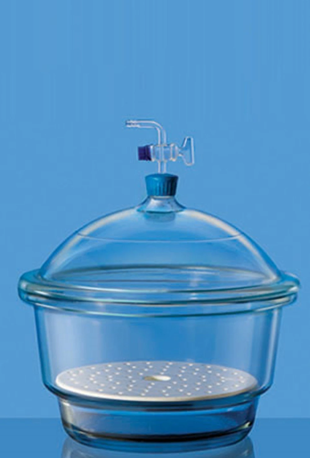 • Complies with IS 6128 • Supplied with cover having stopcock with PTFE spindle, porcelain plate and plastic knob • Simple design for drying under atmospheric pressure • Ground glass flanges • Plates are positioned on an internal ledge within the base • Designed for use under vacuum • Generally used for drying of moist products, and for storage of moisturesensitive substances |