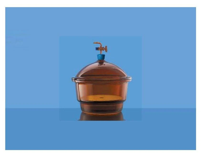 • Complies with IS 6128 • Supplied with cover having stopcock with PTFE spindle, porcelain plate and plastic knob • Simple design for drying under atmospheric pressure • Ground glass flanges • Plates are positioned on an internal ledge within the base • Designed for use under vacuum • Amber coating to protect light sensitive chemicals • Generally used for drying of moist products, and for storage of moisturesensitive substances |