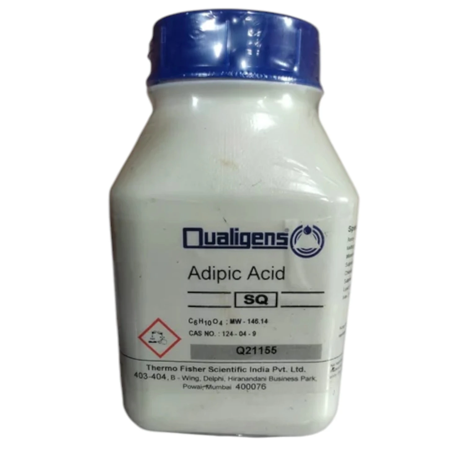 Adipic Acid SQ (C₆H₁₀O₄) is a white crystalline solid used as a key intermediate in the production of nylon, polymers, resins, and plasticizers. Supplied in 500 g laboratory-grade packaging, it offers high purity for research and industrial applications. |