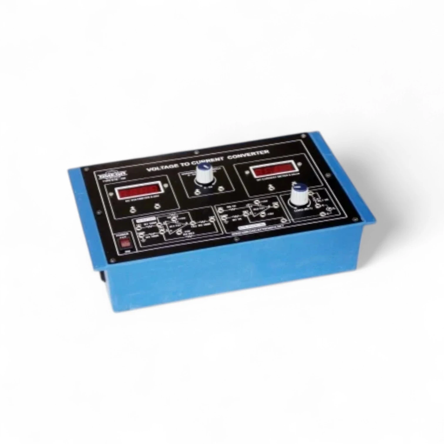 This trainer is designed to study the working principle of a Voltage to Current (V to I) Converter circuit using operational amplifiers. A V-I converter converts an input voltage signal into a proportional output current, and is widely used in analog signal processing, transducers, industrial instrumentation, and current-driven loads. Equipped with a constant regulated (C.R.) power supply and two digital meters for simultaneous monitoring of input voltage and output current, the trainer provides a hands-on approach to understand feedback-based current control and op-amp applications. Key Features: