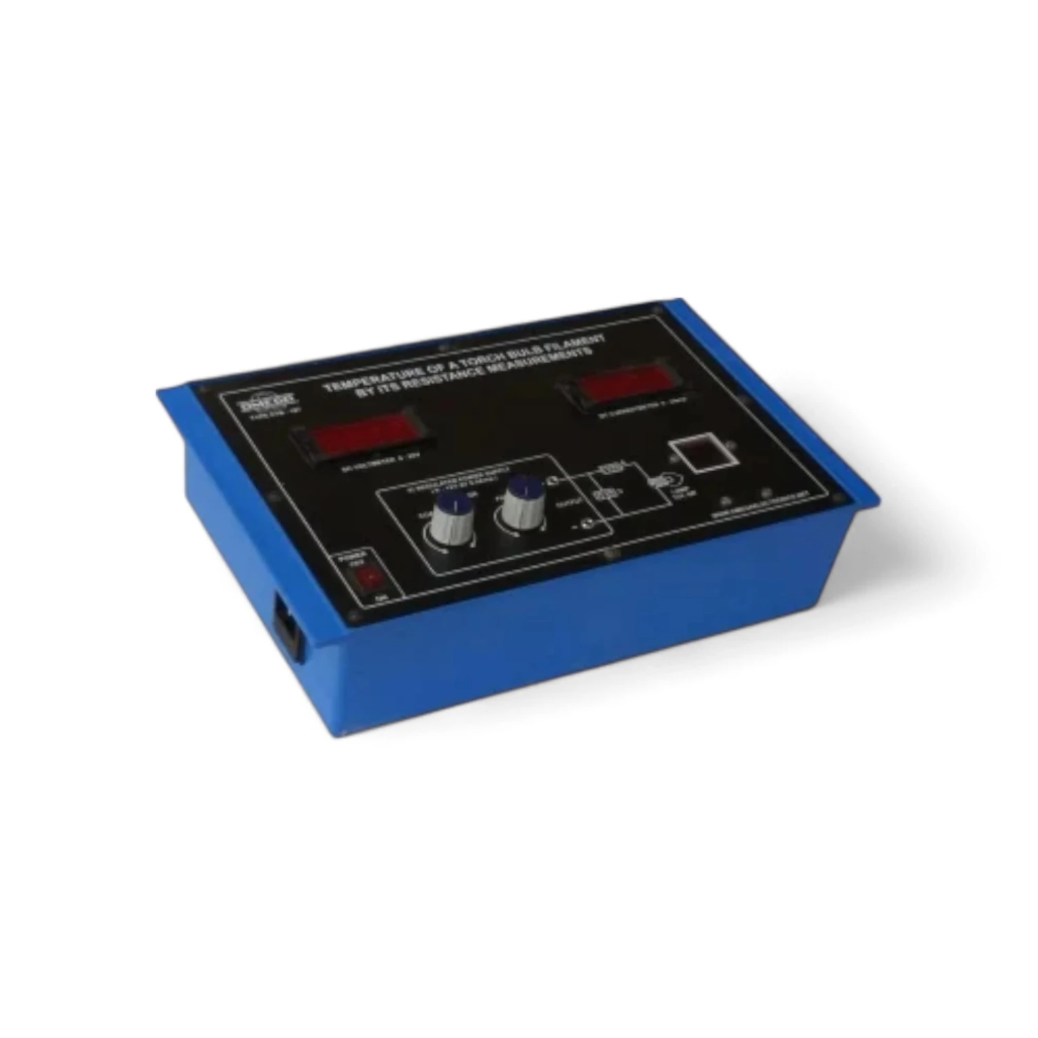 This experimental setup is designed to determine the temperature of a torch bulb filament by measuring its electrical resistance at various applied voltages. The setup is based on the principle that the resistance of a metal filament (usually tungsten) increases with temperature, allowing for indirect temperature estimation through V-I characteristics. The trainer includes: