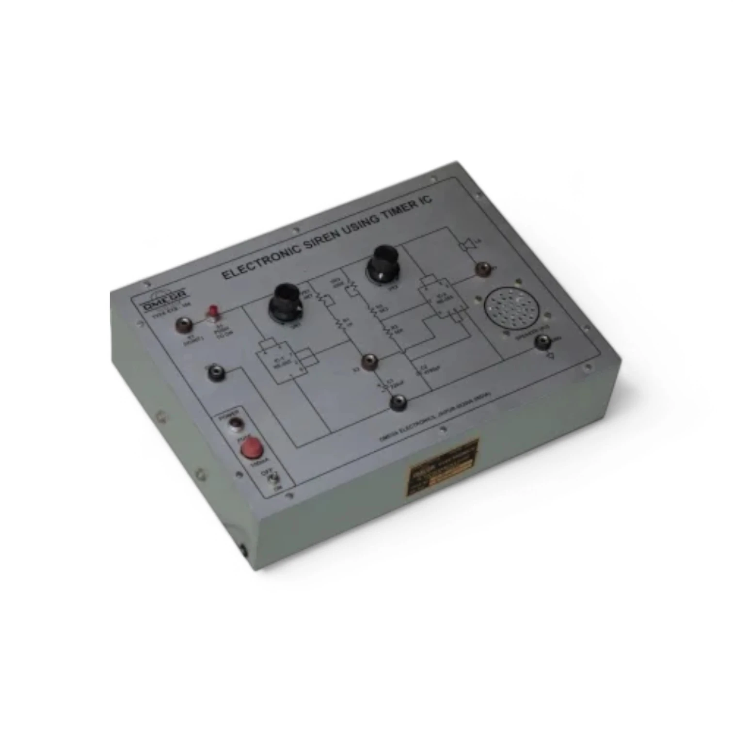 The ETB-188 Electronic Siren Trainer is designed to demonstrate the operation of audio frequency generation using timer ICs, such as the popular IC 555. This trainer simulates a variety of siren effects (ambulance, police, fire) by generating modulated audio tones through frequency control and waveform shaping. It features: