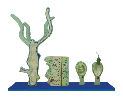 • 4 piece model mounted on board. • Significant anatomical features shown include ectoderm, mesoglea, coelenteron, male testis and female egg cells, buds, hypostome, nematoblast cells, cnidoblast etc. • 28 parts are labeled in total. |