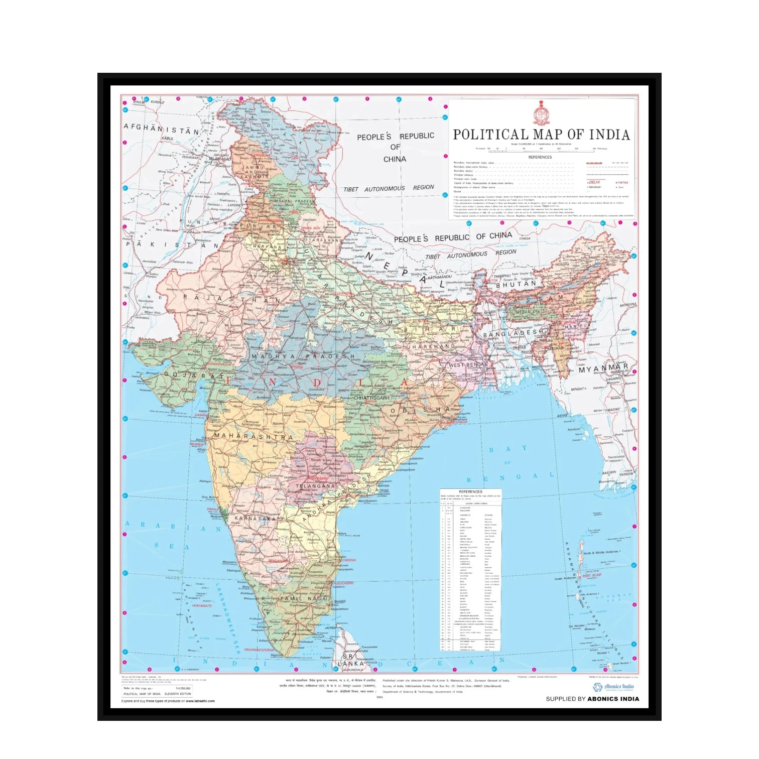 Displays India’s geographical features such as the Himalayas, Thar Desert, Deccan Plateau, coastal plains, and river valleys. Ideal for studying the topography and physical landscape of India.