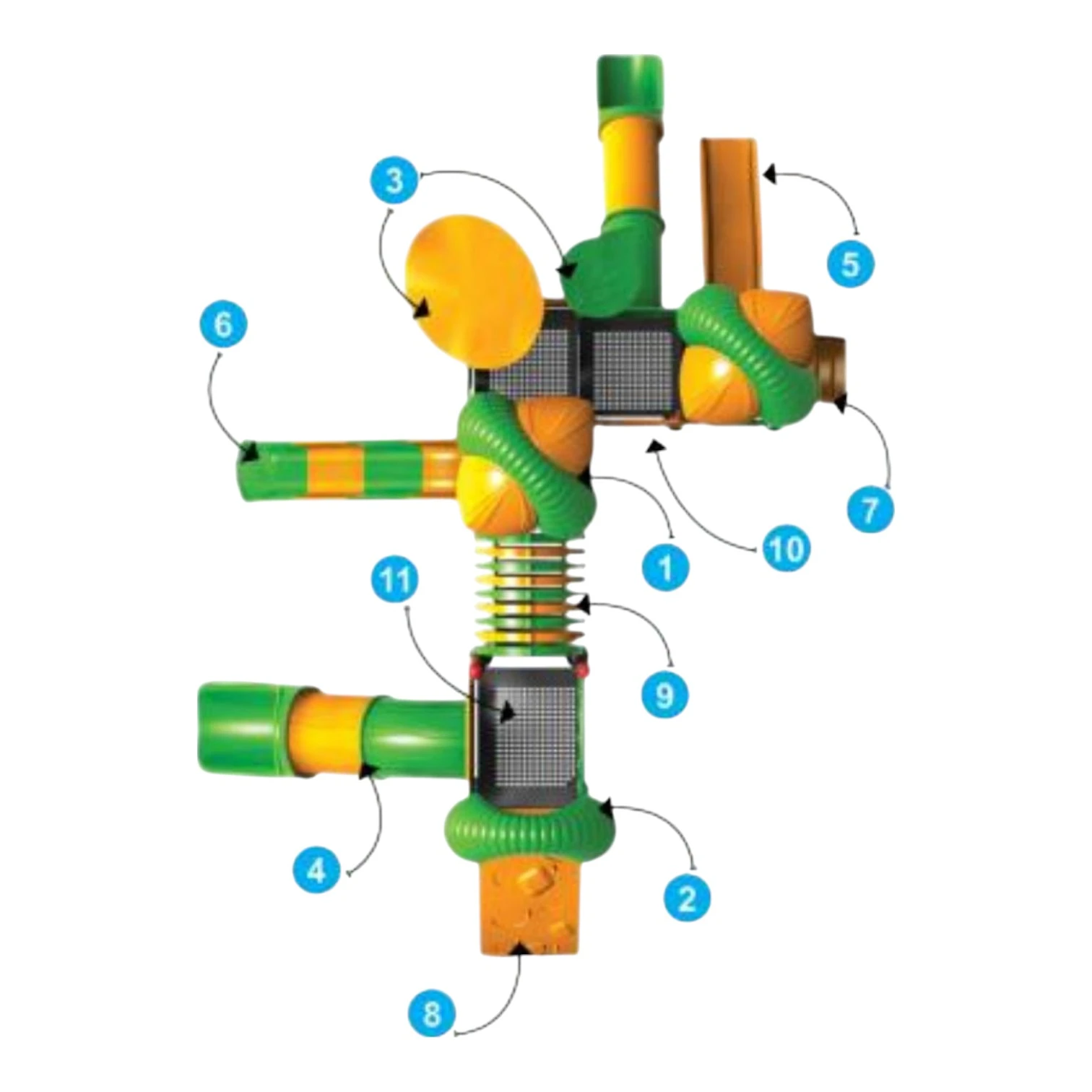 This junior play centre combines a built-in playhouse, wave slide, two tunnel sliders, a single straight slide, part slider, ring tunnel, and a small climber within a low-rise framework. Its layout promotes imaginative, multi-positional play.