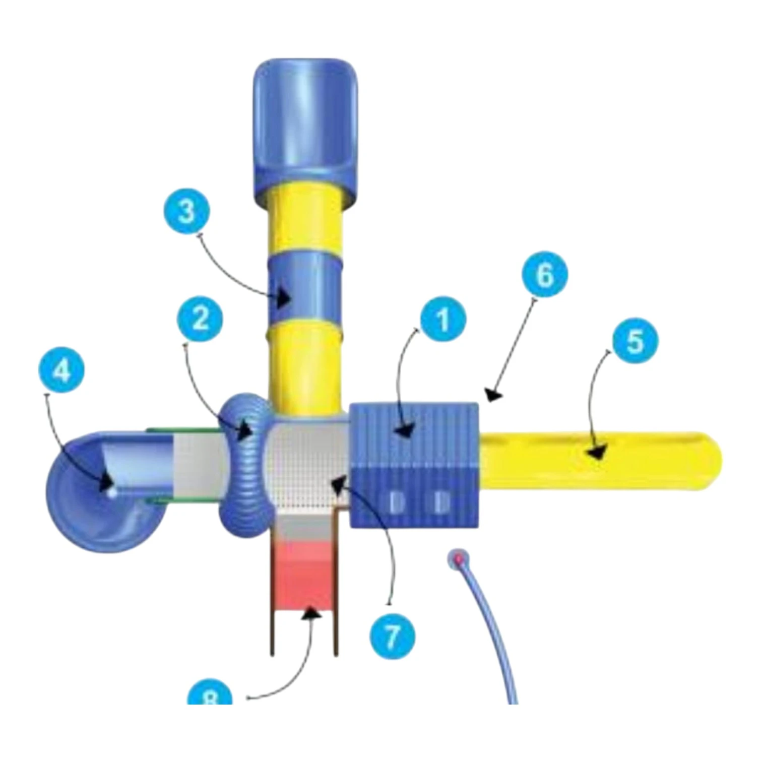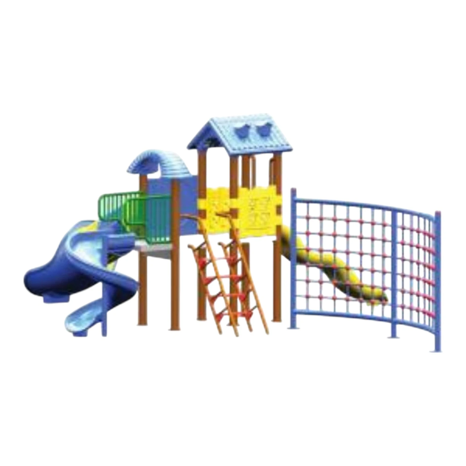 Installed elements include a 5‑ft tunnel slider, 5‑ft spiral slide, 5‑ft single slide, MS perforated decks, MS ladder, panel games, and a net climber—offering a rich diversity of climbing, sliding, and social activity options.