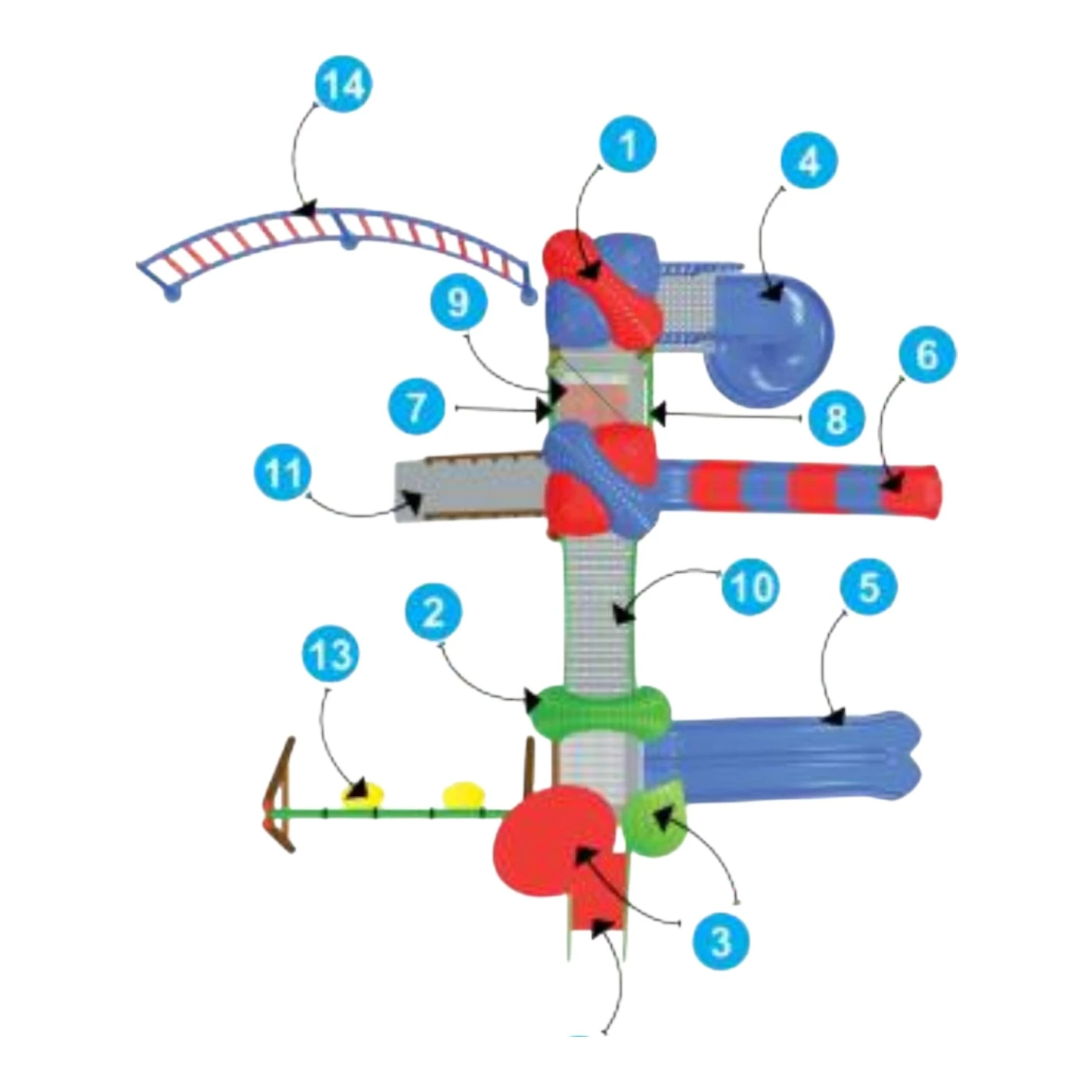 Nodes of climbing, crawling, swinging, and sliding help build gross motor strength, coordination, balance, spatial skills, and teamwork among peers in active, imaginative play
