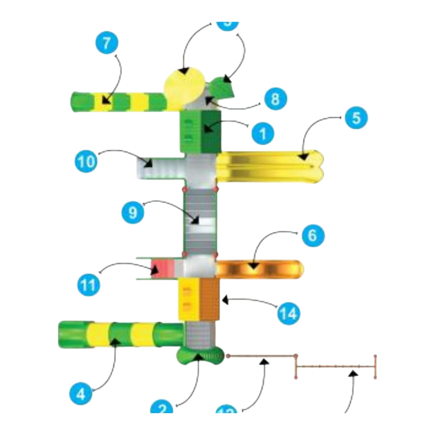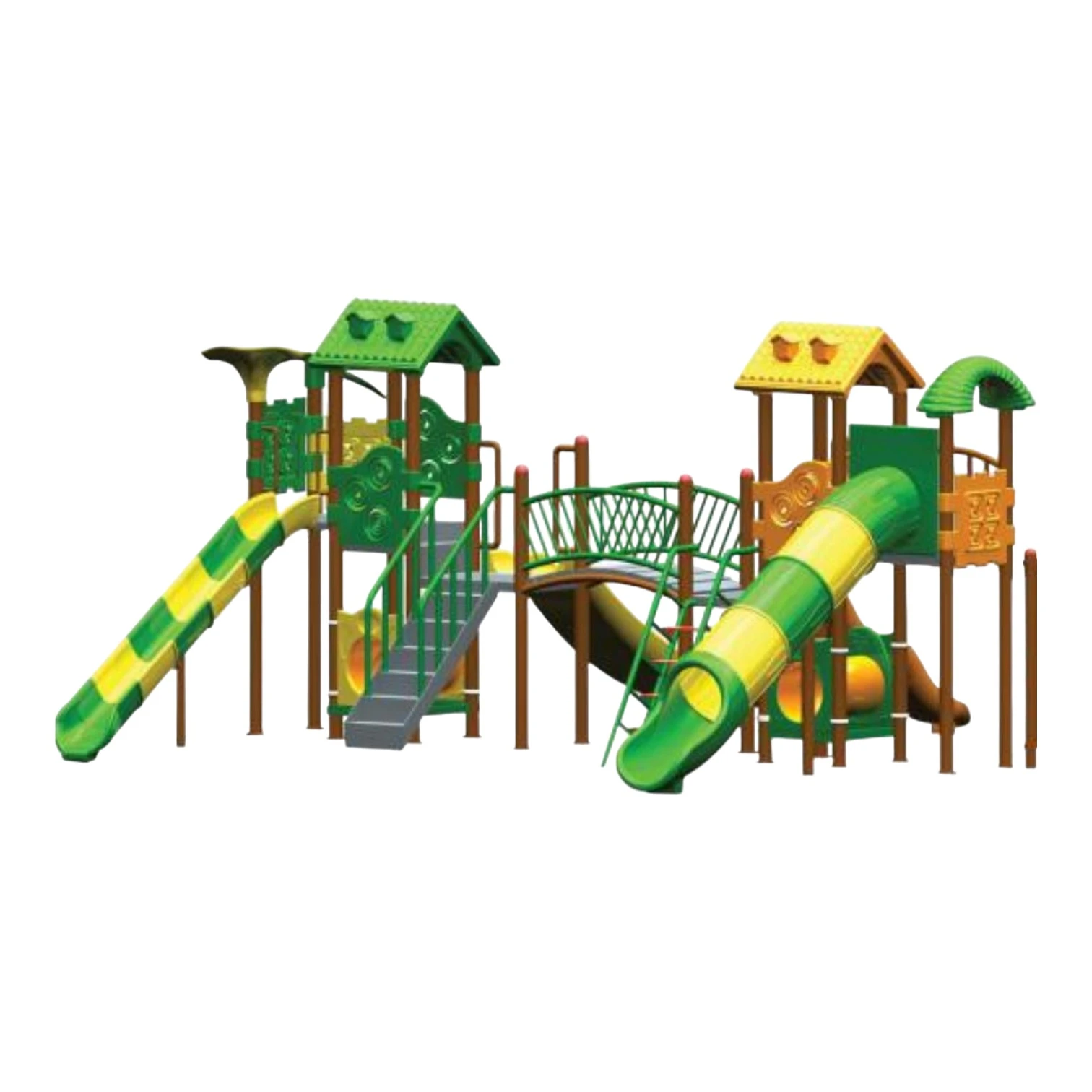 This playzone showcases multiple themed rooftops (including hut-shaped and single-curved designs), along with a decorative leaf-and-flower motif. It features a 7 ft tunnel slider, 5 ft single slider, 5 ft double slider, 7 ft part slider, MS net climber, MS loop set, five perforated square decks, a bridge, a box ladder, and a step ladder. All plastic parts are rotomoulded for safety and longevity .