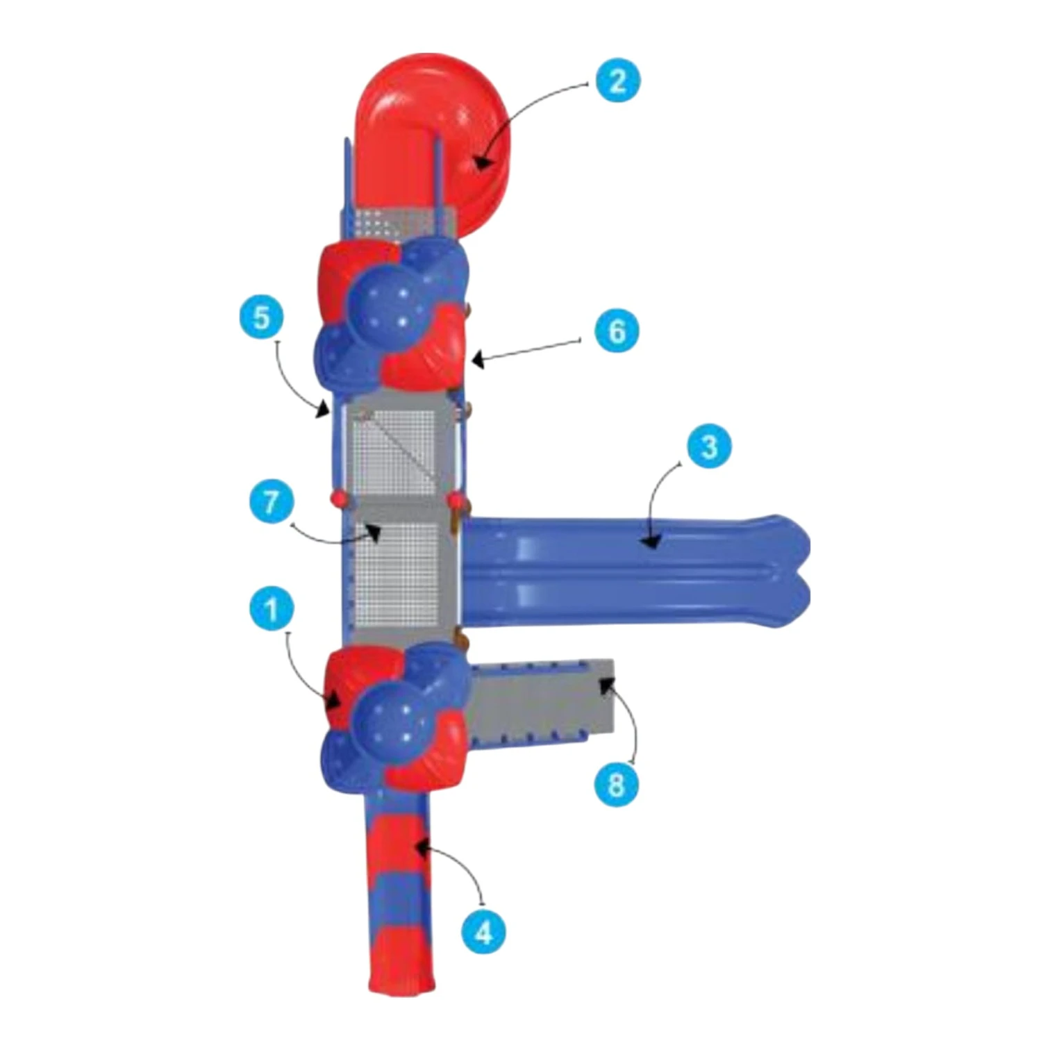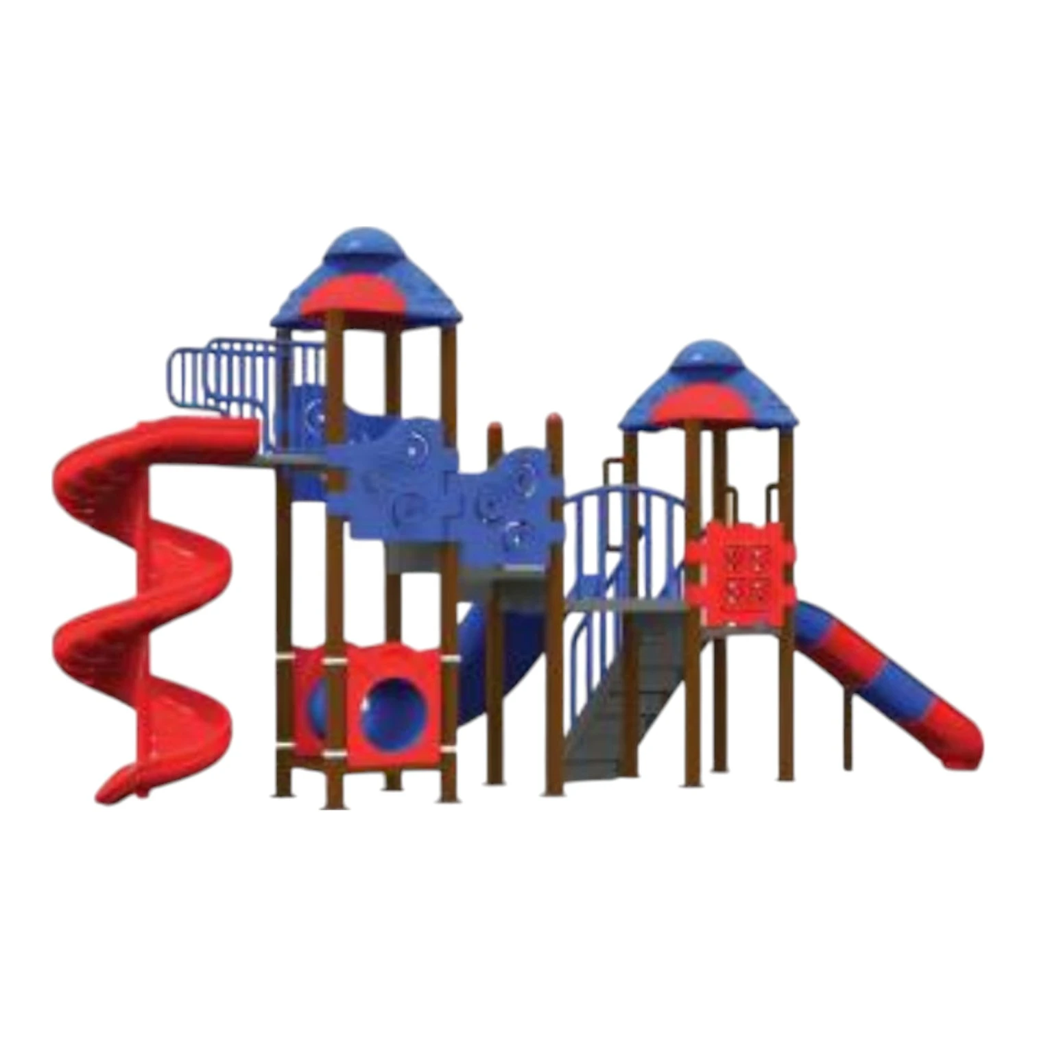 Equipment includes a 7‑ft spiral slide, 5‑ft double wave slide, tunnel bridge, part slider, perforated square decks, MS box ladder, and access panels—offering visual appeal and diverse climbing and sliding opportunities.