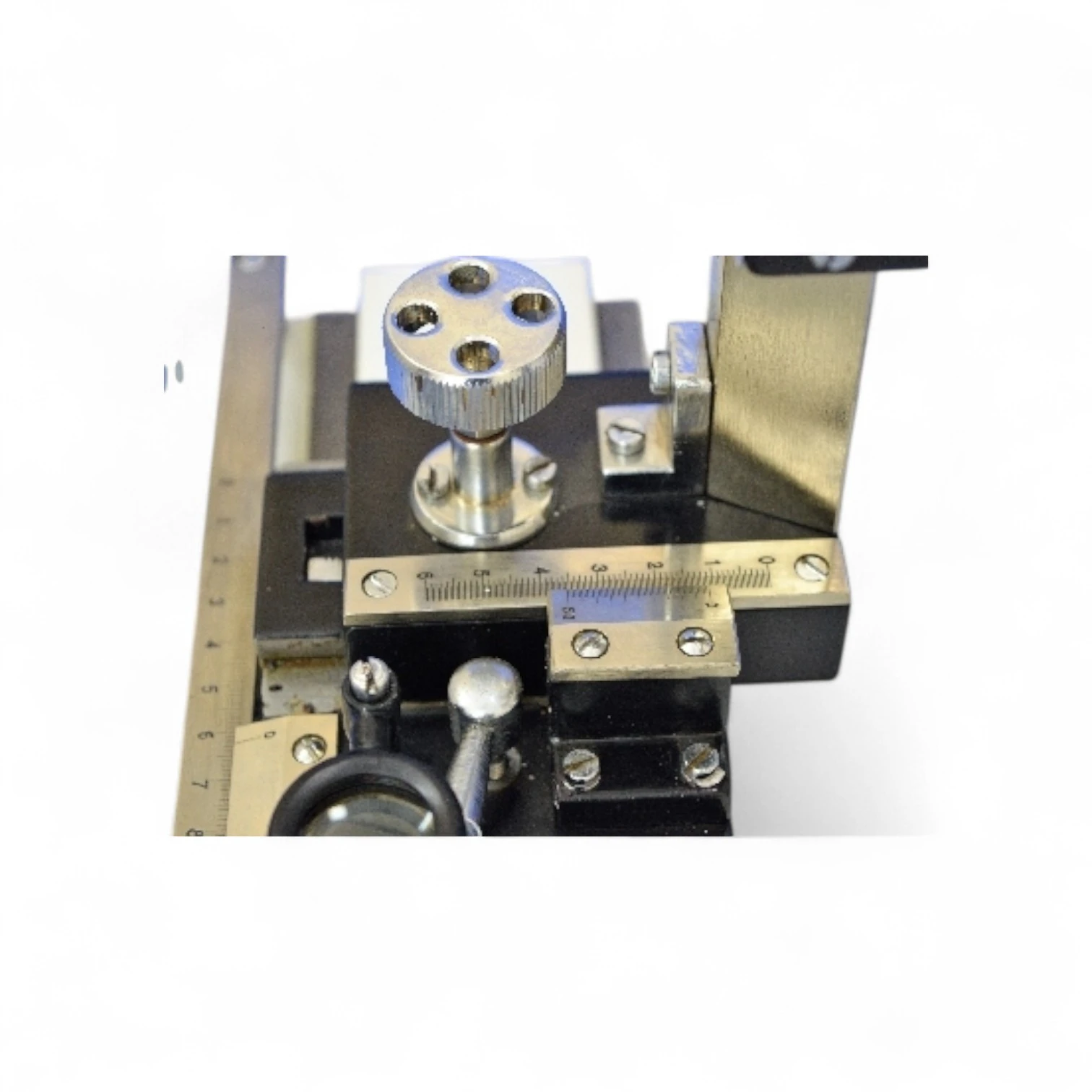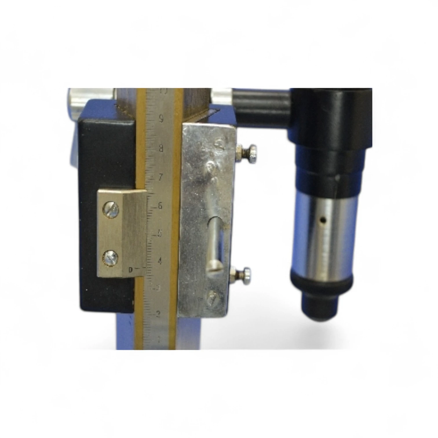 The Traveling Microscope (TVM-03) is a high-precision laboratory instrument designed for accurate measurement of small linear dimensions, displacements, and optical parameters. This advanced model is ideal for performing experiments in physics and optics, including studies involving Newton’s rings, interference fringes, refractive index determination, and small object diameter measurements. The TVM-03 features a rigid cast-iron base, finely graduated brass scales, and a high-resolution vernier scale with least count up to 0.01 mm. The microscope is mounted on a horizontal carriage that moves smoothly along guide rails, with both vertical and horizontal adjustments using micrometer screw mechanisms for precise alignment. The optical assembly includes a fully coated achromatic objective lens and a rack and pinion focusing system for sharp and distortion-free magnification. Enhanced mechanical stability and fine adjustments make the TVM-03 suitable for research laboratories, metrology studies, and advanced optical experiments. |