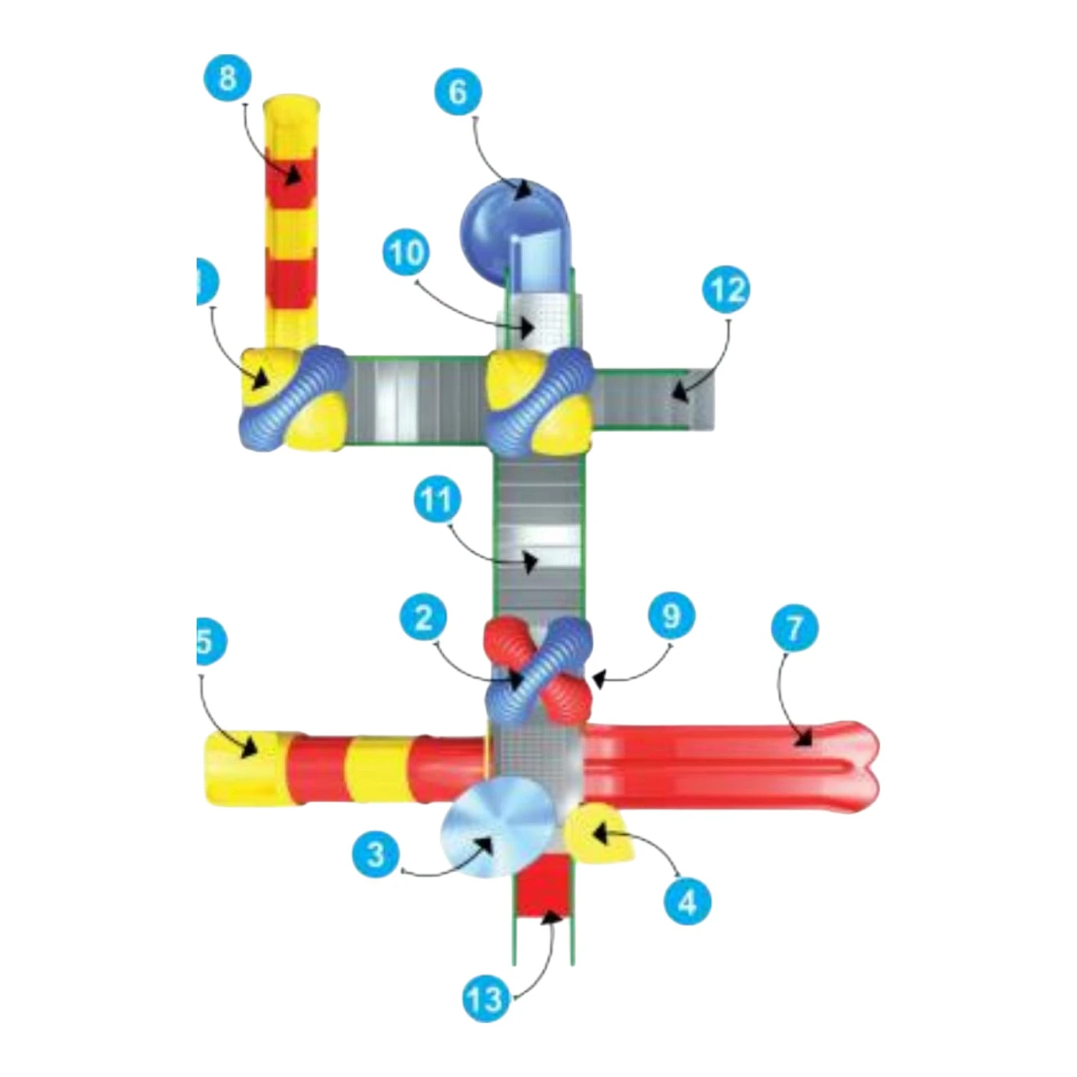 Children engage with features that build lower-body strength (ladder climbs), balance and coordination (bridges and decks), vestibular awareness (spiral and tunnel slides), and promote cooperative turn-taking and imaginative group interaction.