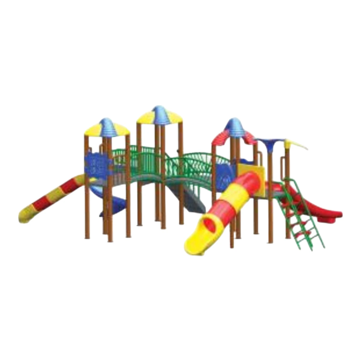 This playzone includes two curved roofs, two single-curved roofs, leaf and flower motifs, and a range of slide types: a 5 ft tunnel slider, a 5 ft spiral slider, a 5 ft double slider, plus a 7 ft part slider. It also features four perforated steel decks, two metal bridges, a box ladder, a step ladder, and four play panels—offering diverse activity across its structure .