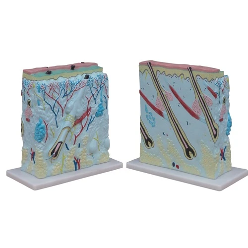 A greatly enlarged (105 times) cross sectional view of the human skin showing three layersepidermis, dermis, hypodermis, structures of the human scalp and a close-up view of a hair follicle, sweat gland, fatty tissue, sebaceous gland, blood vessels & nerves. Front, side and back view. • Mounted on a plastic base. • Size: 27 × 10 × 31cm. |