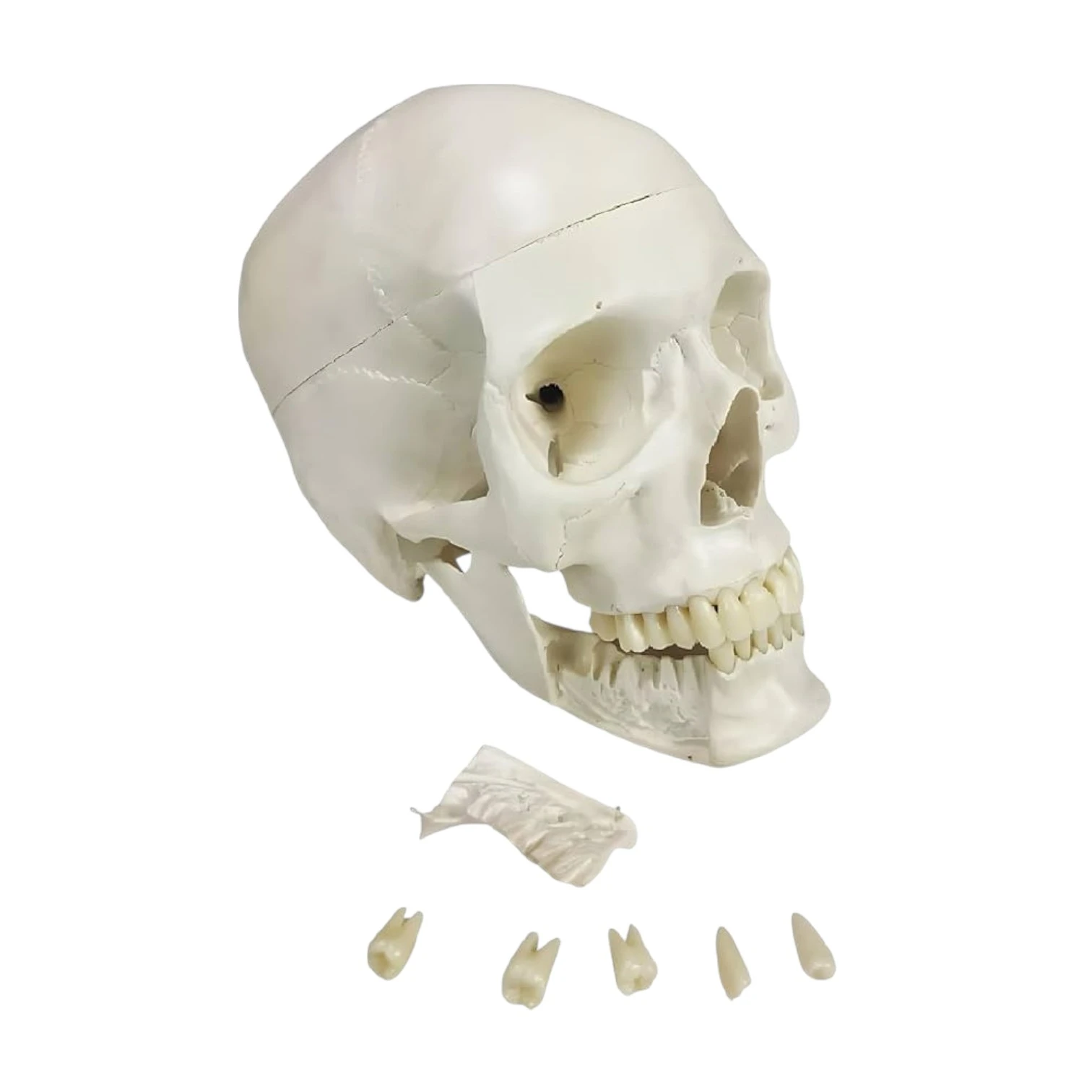 • Life size •Made of PVC • Dissectible into 4 parts. • This high quality classic skull with 16 teeth for extraction is medically detailed in structure. The teeth of the lower jaw can be individually extracted and replaced, and have fully formed roots for detailed examination. The model has a bone flap on its right mandible for viewing the dental roots, spongiosa, nerve canal, and an impacted wisdom tooth. The calvaria is removable to show the internal structure of the skull . The mandible is articulated and removable. All of the joints, sutures, fissures, foramen, and styloid processes are highly accurate. • It is a perfect tool for anatomical and dental study. • Key card / Manual provided. |