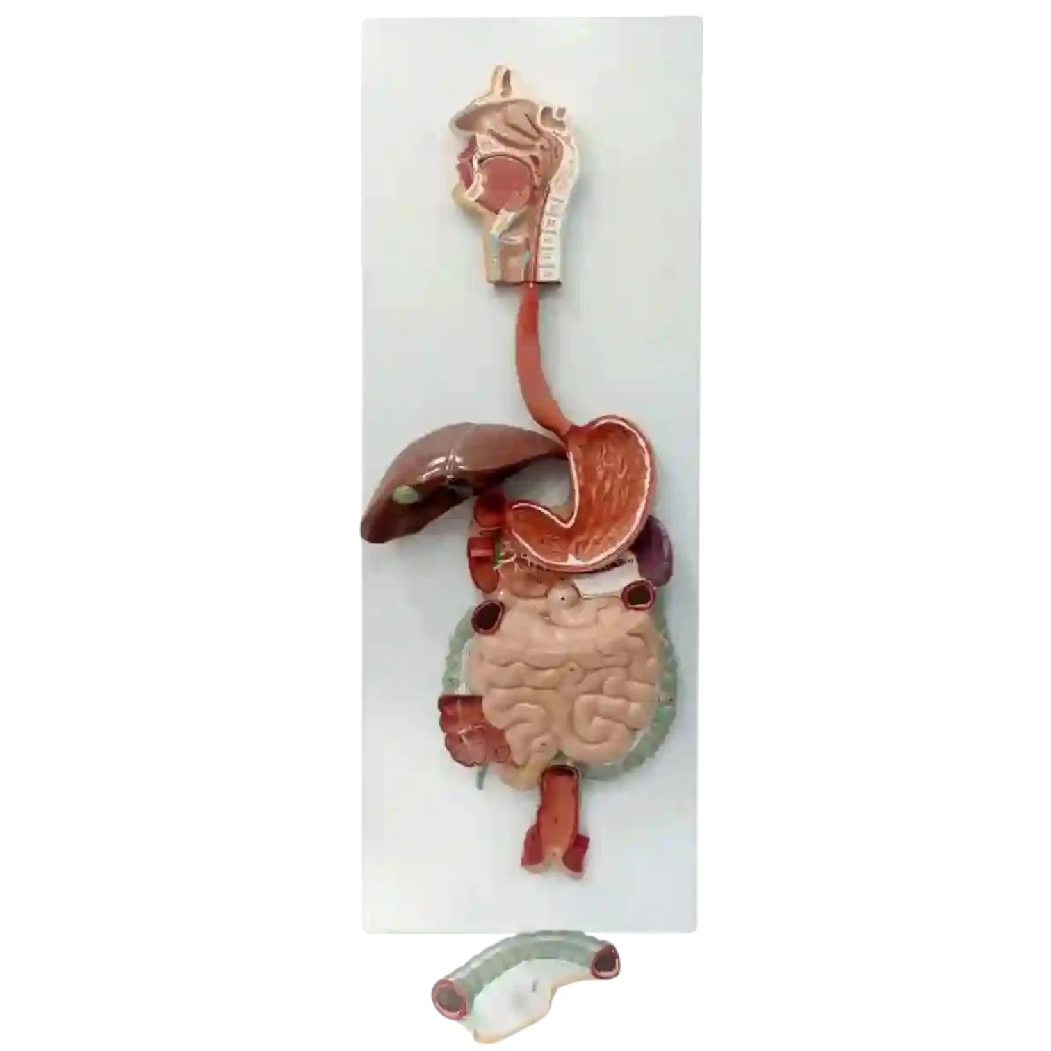 • Life size •Made of PVC • Dissectible in 2 parts. • The oral cavity, the pharynx and the first part of the esophagus are dissected along the medial sagittal plane. The liver is shown together with the gall bladder and the pancreas is dissected. The Stomach is open along the frontal plane; the duodenum, caecum, part of the small intestine and the rectum are open to expose the interior. The transverse colon is removable. The relief model of the head shows the anatomy of the mouth with salivary glands. • Mounted on base. • 51 features marked. • Key card / Manual provided |