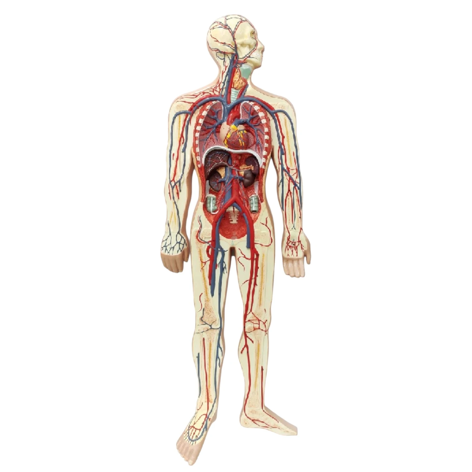 • Size : Half life Size • Made of PVC • This model is a half life-size relief model which includes a 2 part removable heart and exceptional details. • Following anatomical structures are in detail: The arterial/venous system, the heart, the lungs, the liver, the spleen, kidneys, and a partial skeleton. • Mounted on base. •70 features marked. • Key card / Manual provided |