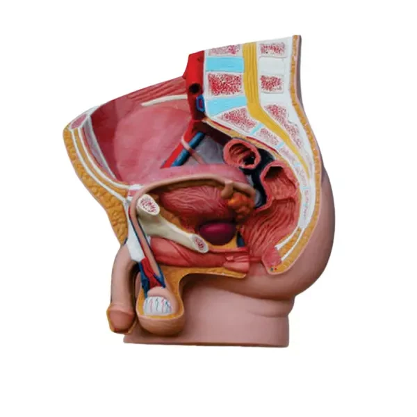 30x22.5x27.5 cm • Made of PVC • Dissectable in 4 parts • Open through the medial sagittal section of male pelvis, this model shows the internal organs of urinary, male reproductive system and muscular anatomy • Mounted on base. • 26 features marked. • Key card / Manual provided |