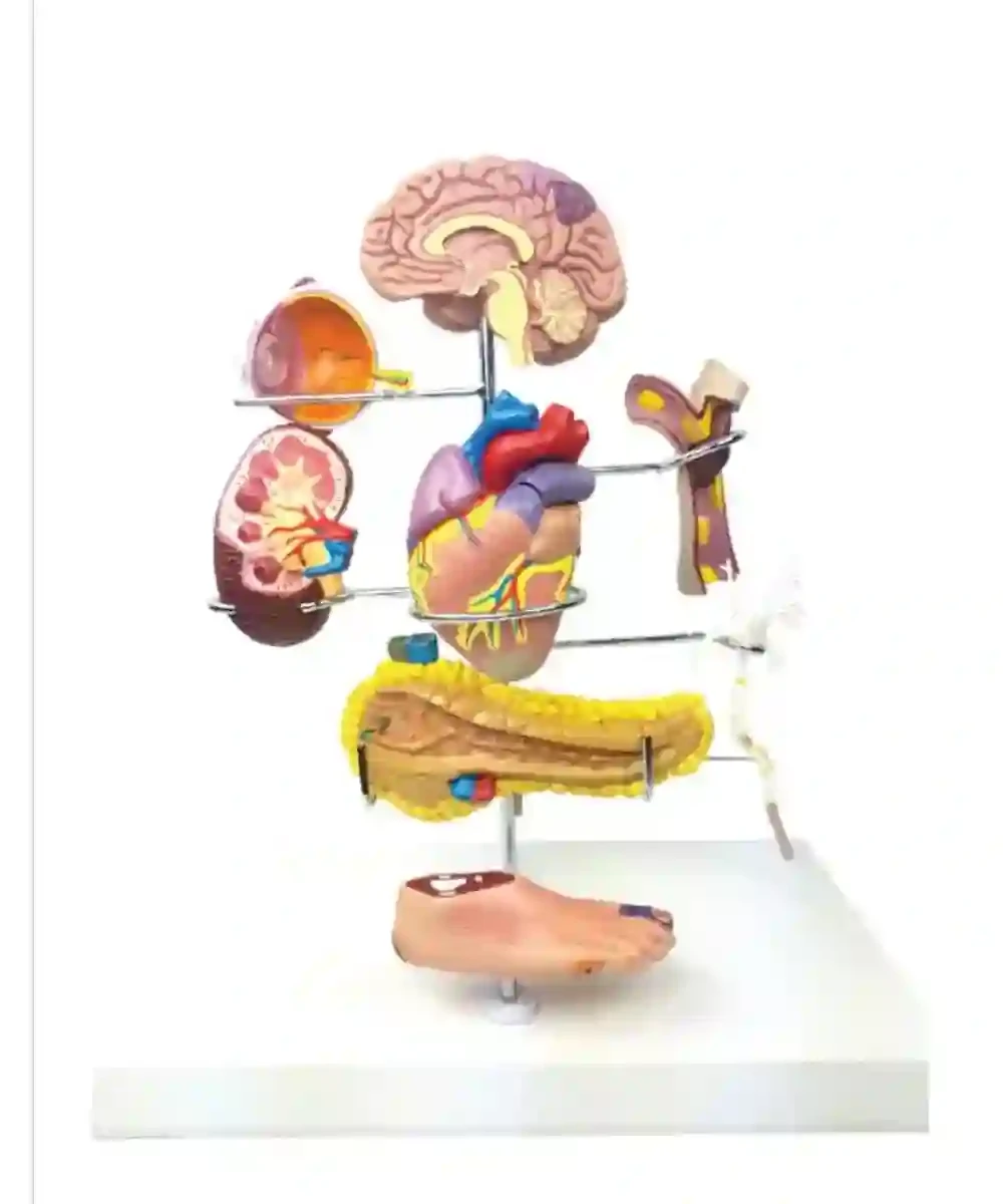 • Made of PVC • Easy to remove and assemble. • The model shows the effects of diabetes on the brain, eye, heart, kidney, artery, pancreas, neuron and foot. • Model can be used to illustrate effects associated with diabetes: stroke, noninflammatory disease of the retina, hypertensive heart disease, hardening of the kidney, hardening of the arteries, insulin resistance, neuropathy, and foot ulcerations. • Key card / Manual provided |