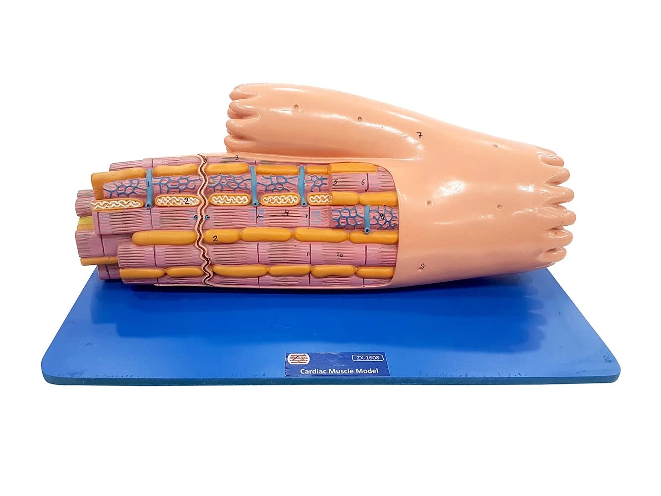 Block model is greatly enlarged cardiac muscle fibre. • The model shows significant anatomical structures such as sarcolemma, nucleus, mitochondria, transverse tubules, cardiomyocytes, sarcoplasmic reticulum, intercalated disc, M line, Z disc & various filaments. • Mounted on durable wooden base. |