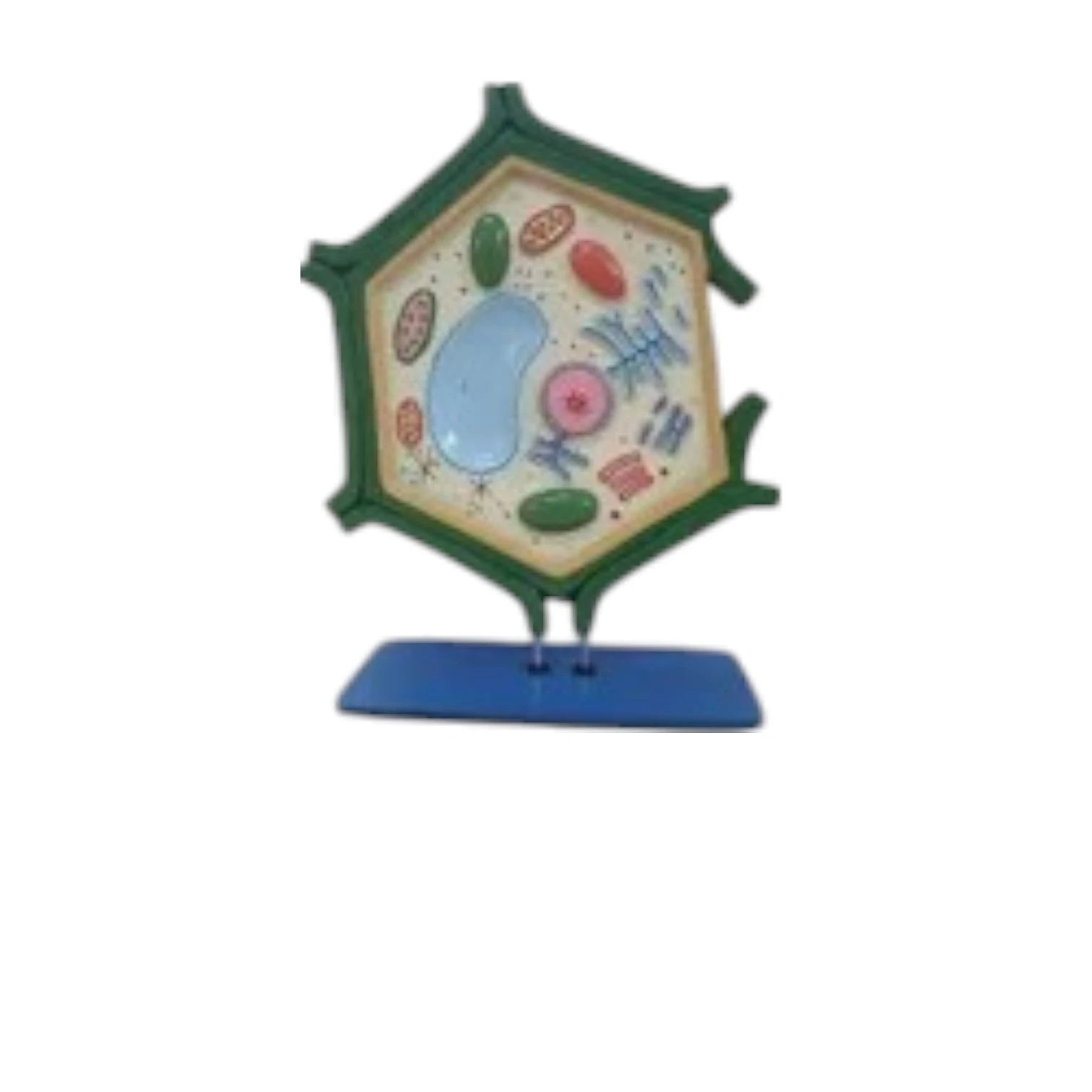 Plant cell model depicts magnified view with all important structures such as chloroplast, mitochondria, nucleus, golgi bodies etc. • Mounted on sturdy wooden base. 2950 (A) • Size: 35 x 15 x 49 cm. • 17 features marked. |