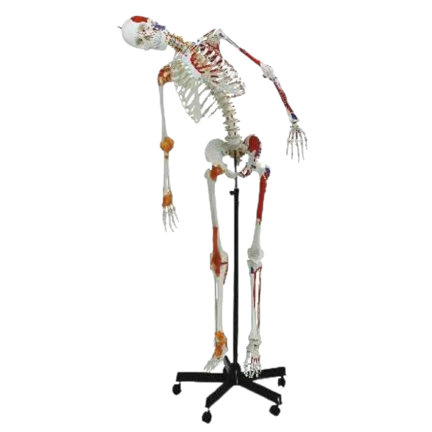 • Life size • Made of PVC • Natural cast of a male adult skeleton. • Demonstration of anatomically accurate natural movements. • The articular ligaments of the joints are shown on right side. • The points of origin (Red) and attachment (Blue) of the most important muscles from head to foot are marked in colour on the left side. • Cer vi cal arter y, ner ves, prolapsed (herniated) disk & hyoid bone shown. • Coccyx separately mounted. • Sacral canal clearly depicted. • Mounted on stand with rollers. • 167 features marked. • Key card / Manual provided |