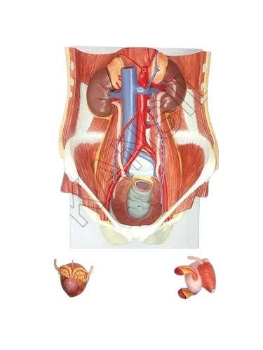 Life Size • Made of PVC • Mounted on stand. • Dual sex • It shows components of urinary system, posterior abdomen wall, kidney, adrenal gland & bladder. • It also shows pelvic bone and muscles, Inferior vena cava, aorta with its branches including iliac vessels and Rectum. • One front half of a kidney is removable • Key card / Manual provided. |